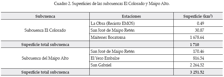 El trabajo de la delimitación de subcuencas y polígonos de Thiessen se llevó a cabo con las extensiones Basin y Xtools de Arcview, respectivamente, para lo cual se utilizó la carta topográfica digital (escala 1:50 000) de la zona del Cajón del Maipo, ubicada en la Región Metropolitana de Chile. Las superficies abarcadas a través de polígonos de Thiessen para las dos subcuencas de estudio fueron las que se presentan en el cuadro 2.