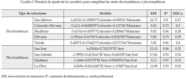 En ambas variables se probaron regresiones simples y múltiples, optando por aquella que presentaba el menor error estándar de estimación. Las estaciones Río Colorado, antes Junta Río Maipo, y Río Maipo en El Manzano se tomaron como estaciones patrón en el caso de los caudales por ser las estaciones más largas y completas en sus registros. La integración de los datos se realizó con un error estándar de estimación promedio de 8.84 m3/s. El porcentaje de datos que se debió completar fue del 24.9%.