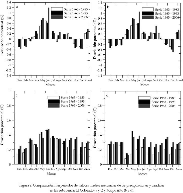 Destaca asimismo que los meses de noviembre, diciembre, enero y febrero muestran un descenso de las precipitaciones, en comparación con el primer periodo. De igual forma, la figura 2b muestra en los primeros cuatro meses de inicio del año hidrológico un aumento en las precipitaciones en la subcuenca del Maipo Alto, aunque en el último periodo (1963-2006), ese aumento es menor que el producido en la subcuenca El Colorado. En los meses estivales se manifestó claramente un decremento en las precipitaciones a lo largo de los tres periodos evaluados.
