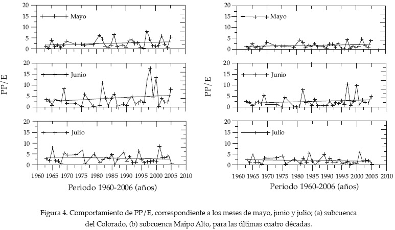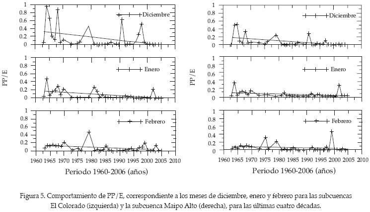 El coeficiente PP/E para los meses húmedos de mayo, junio y julio, tanto para la subcuenca del Colorado (figura 4, izquierda) como para la subcuenca del Maipo Alto (figura 4, derecha) presenta valores que generalmente denotan montos superiores a 1, lo que se traduce en que las precipitaciones fueron mayores que los caudales y ello es diferente a lo que se observa anualmente. También se observan valores que no sobrepasaron el valor 1, lo que se podría asociar con años secos. El punto más alto en el gráfico se produce en el invierno de 1997, año con clara influencia del fenómeno El Niño, con presencia de lluvias muy por sobre lo normal, mientras que 1998 denotó un valor muy bajo y ello porque es sabido que ese año hubo una sequía que fue evaluada como de las peores del siglo XX. Por tanto, en esos periodos el deshielo aumenta exageradamente los caudales, lo que contrasta con precipitaciones escasas. Por otra parte, en los meses secos se aprecia que los valores del coeficiente en ningún caso superan el valor 1, de lo cual se infiere que las precipitaciones no han superado el valor de los caudales (figura 5). Asimismo, es importante destacar la tendencia en los meses de estiaje de la relación PP/E, que es evidentemente negativa en el tiempo, lo que indicaría que los caudales han tendido a crecer más que las precipitaciones, pudiendo atribuirse a un cambio en las temperaturas y una mayor incidencia de éstas en el proceso de derretimiento glaciar. También se debe considerar que en esta región la isoterma de 0 °C ha sufrido un alza de altura por el proceso de calentamiento global y por ende las crecidas invernales de los ríos de las subcuencas andinas del Maipo se han visto incrementadas por el consiguiente aumento de los aportes hídricos, lo que también implica una clara incidencia negativa en los niveles de las reservas hídricas en forma de nieves y hielos.