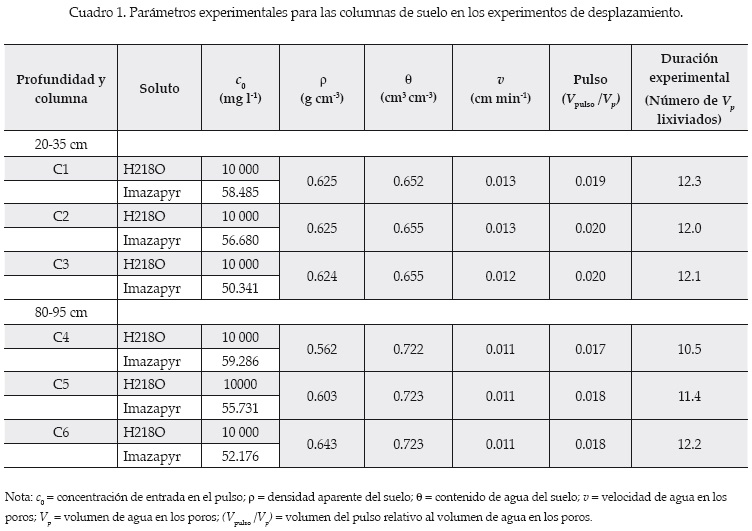 Previo a los experimentos se obtuvieron muestras de suelo de cada extremo de la columna para determinar el contenido de imazapyr y de humedad. La columna de suelo fue colocada sobre una base cóncava, cuyo arreglo permitía la colección y extracción del lixiviado. En la parte superior de la columna se colocó un simulador de lluvia compuesto de un reservorio de 500 ml y nueve agujas de goteo (0.5 mm de diámetro/aguja). En un primer tiempo, alrededor de tres volúmenes de poro de la solución reconstituida del suelo fueron lixiviados a través de la columna hasta alcanzar una tasa de flujo uniforme y el equilibrio en la composición de la solución del suelo. Para ello se utilizó una bomba peristáltica tanto a la entrada como a la salida de la columna, a modo de establecer el flujo uniforme en condición de no saturación. La velocidad de flujo estuvo en el rango de 0.44 a 0.48 cm3 min-1, lo cual produjo velocidades de agua de poro de 0.011 a 0.013 cm min-1. El siguiente paso fue aplicar un pulso de 0.025 volúmenes de poro, con una concentración de 10 000 mg l-1 de H218O (como trazador del agua) y de 50.3 a 59.3 mg l-1 de imazapyr, equivalente a 2 mg imazapyr kg-1 suelo seco, en promedio. Este pulso fue lixiviado a través de la columna, utilizando de 10 a 12 volúmenes de poro de la misma solución reconstituida. Los parámetros experimentales se presentan en el cuadro 1.