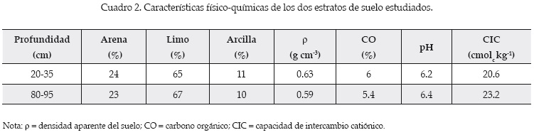 El contenido de carbono orgánico, el tipo de arcillas y su composición, así como el pH del suelo afectan el proceso de adsorción. Los dos estratos del suelo estudiado son homogéneos respecto a estas características (cuadro 2). El suelo presenta textura limosa, con un contenido de arcillas no mayor de 11%, el pH es ligeramente ácido y el contenido de carbono orgánico de 5.7% en promedio. Prado et al. (2007) reportaron contenido de arcilla tipo alofano de 22.5 y 27.7%, presentes en el contenido de arcilla total para los estratos superior e inferior, respectivamente. El contenido de hierro extraído al oxalato varía de 1.2 a 1.3% entre 15 y 100 cm de profundidad del perfil de suelo. Para estos mismos estratos, Prado (2006) reportó valores de conductividad hidráulica a saturación de 0.5 a 1.7 m d-1 y de 0.2 a 0.9 m d-1, lo cual indica la alta permeabilidad en el perfil de este suelo.