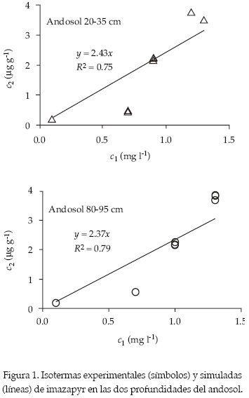 Las isotermas de adsorción se presentan en la figura 1. La forma de las isotermas indica que a baja concentración ocurre una baja adsorción, la cual aumenta al incrementarse la concentración. Aplicando el modelo lineal se obtuvieron valores de Kd de 2.43 cm3 g-1 para el estrato superior y 2.37 cm3 g-1 para el estrato inferior, con ajustes (r2) de 0.75 y 0.79, respectivamente. También se usó el modelo de Freundlich. Se observó un ajuste ligeramente mejor (r2 = 0.76 y 0.83) que el modelo lineal; los valores de Kf obtenidos fueron de 1.83 y 1.84 para las profundidades de 20 y 80 cm, respectivamente. Los valores del coeficiente de potencia (N) del modelo de Freundlich (ecuación (1)) fue de 1.04 para ambas profundidades estudiadas. Con base en lo anterior, es posible decir que en el rango de concentraciones evaluadas, 0.2, 0.9, 1.8 y 2.7 mg l-1, equivalentes a 0.5 a 6.8 mg imazapyr kg-1 suelo seco, la adsorción de imazapyr ocurrió de forma lineal en ambos estratos del andosol estudiado. El estudio de la adsorción de imazapyr en este suelo también se hizo a concentraciones mayores de las señaladas, observándose que a concentraciones superiores de 3 mg l-1, la adsorción deja de ser lineal.