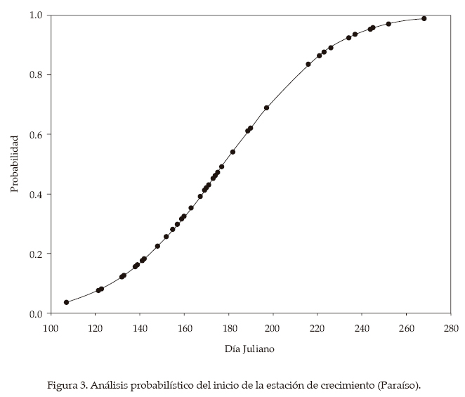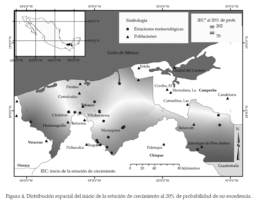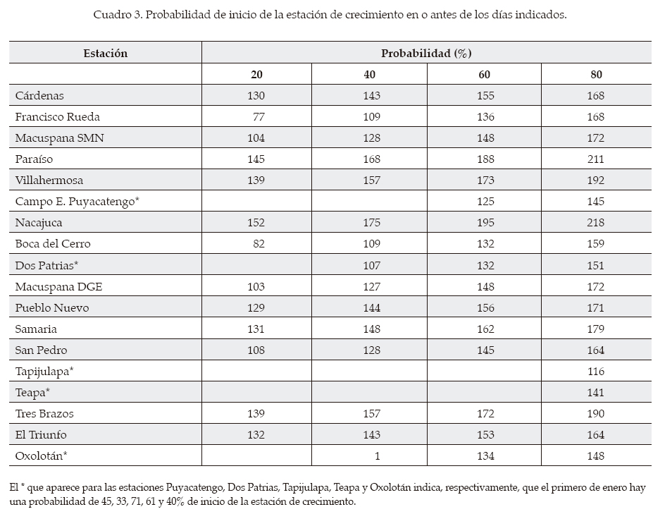 En el cuadro 3 se muestran las fechas de inicio de la estación de crecimiento al 20, 40, 60 y 80% de probabilidad de no excedencia calculada, para todas las estaciones que se utilizaron en el estudio. Para el 20%, el inicio osciló entre los días 77 (18 de marzo) y 152 (1 de junio); para el 40%, entre 1 (1 de enero) y 175 (24 de junio); para 60%, entre 125 (5 de mayo) y 195 (14 de julio), y para el 80%, entre 116 (26 de abril) y 218 (6 de agosto). Estos valores se interpretan de la siguiente manera: para la columna del 20%, los valores indican que en un año de cada cinco, el inicio de la estación de crecimiento ocurre ese día o antes para el área de influencia de esa estación, mientras que para el 40, 60 y 80% son dos, tres y cuatro de cada cinco, respectivamente.