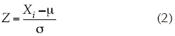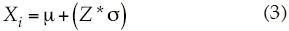 Donde Xi es el día Juliano; μ, la media de los días (día Juliano) en los que ha iniciado la estación de crecimiento para los años de los que se disponen datos, y s es la desviación estándar. Esta expresión permite conocer la probabilidad que le corresponde a cada uno de los días del año; dicha probabilidad se obtuvo de tablas de probabilidades acumuladas de la distribución normal (Saíd y Zárate, 2001). Para conocer el día del año en que inicia la estación de crecimiento a los niveles de 20, 40, 60 y 80% de probabilidad, se le aplicó a estos niveles la distribución normal estándar inversa para obtener Z. De este modo, el día (Xi) en que inicia la estación de crecimiento está dado por: