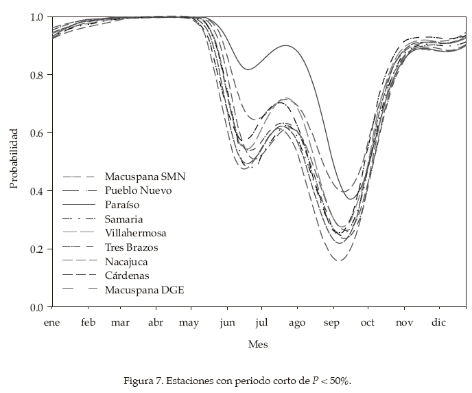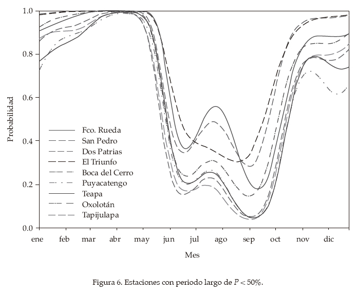 A partir de las curvas de probabilidad de ocurrencia de periodos secos, se encontraron dos grupos de regiones, donde la ocurrencia de periodos secos se presentó de manera diferente, uno con probabilidades < 50% en un periodo "largo" (figura 6) y otro con este tipo de probabilidades en un periodo "corto" (figura 7). Sin embargo, todas las estaciones presentaron altas probabilidades a partir del 27 de octubre, elevándose aún más hasta alcanzar valores muy cercanos a 1 (0.999) entre el 10 de marzo y el 22 de abril (figura 7), cuando según Velázquez (1994) se presentan lapsos secos que duran entre seis y siete semanas, con periodos de retorno de veinte años. Posteriormente, para el primer grupo se inició una drástica caída de la curva cuando la probabilidad fue mayor o igual a 95% (30 de abril) (figura 6); para el segundo grupo, esto inició cuando la probabilidad fue igual o mayor a 93% (17 de mayo) (figura 7). Es importante señalar que las probabilidades de mayor interés en agricultura de temporal son las menores a 50%, que es cuando existe menos riesgo de periodos secos para los cultivos; para el grupo 1 (figura 6), éstas se presentaron entre el 21 de mayo y el 12 de octubre, y su interpretación se ejemplifica con las estaciones Oxolotán y Teapa, cuyas curvas de probabilidad de ocurrencia de periodos secos alcanzaron valores menores o iguales a 30% (del 29 de mayo al 2 de octubre para Oxolotán, y del 7 de junio al 27 de septiembre para Teapa), lo cual indica que en esa temporada se dan periodos secos con duración de siete días en tres de cada diez años; en Dos Patrias, debido a que la curva descendió a valores menores o iguales a 40% (del once de junio al dos de octubre), ocurren periodos secos en cuatro de cada diez años. Para el segundo grupo (figura 7), las probabilidades menores a 50% se dieron del 4 de agosto al 4 de octubre, un tiempo considerablemente menor comparado con el primer grupo. Por mencionar algunos ejemplos dentro de este rango, se encontraron Macuspana DGE (del 4 de agosto al 4 de octubre); Pueblo Nuevo (del 8 de agosto al 1 de octubre), y Nacajuca (del 24 de agosto al 25 de septiembre). A partir de la diferencia en la duración de periodos con probabilidades de mayor importancia agrícola entre los dos grupos, puede decirse que el primero ofrece mejores condiciones a lo largo de la estación de crecimiento, y como en el segundo grupo el periodo de menor riesgo es muy corto (máximo dos meses), puede ser necesario implementar riego complementario para suministrar el agua que los cultivos requieren y que las precipitaciones no alcanzan a satisfacer. Un aspecto importante es que entre el 9 y 22 de julio todas las estaciones presentaron un aumento de la probabilidad, lo cual se debe a que en este lapso ocurre la sequía intraestival, que no es otra cosa más que días con altas temperaturas y escasa precipitación dentro de una temporada húmeda (Velázquez, 1994), originando para el grupo 1 (figura 6) los mayores aumentos (55%) el día 20 de julio en Francisco Rueda, donde ocurren periodos secos de siete días en cinco de cada diez años; para el grupo 2 (figura 7), la mayor elevación de la probabilidad se da esa misma fecha en Paraíso, donde se presentan periodos secos en nueve de cada diez años.