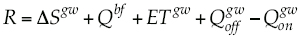, el flujo subterráneo saliente; ΔSgw, el cambio en el almacenamiento; Qfb, el flujo base, y ETgw es la evapotranspiración desde el acuífero
