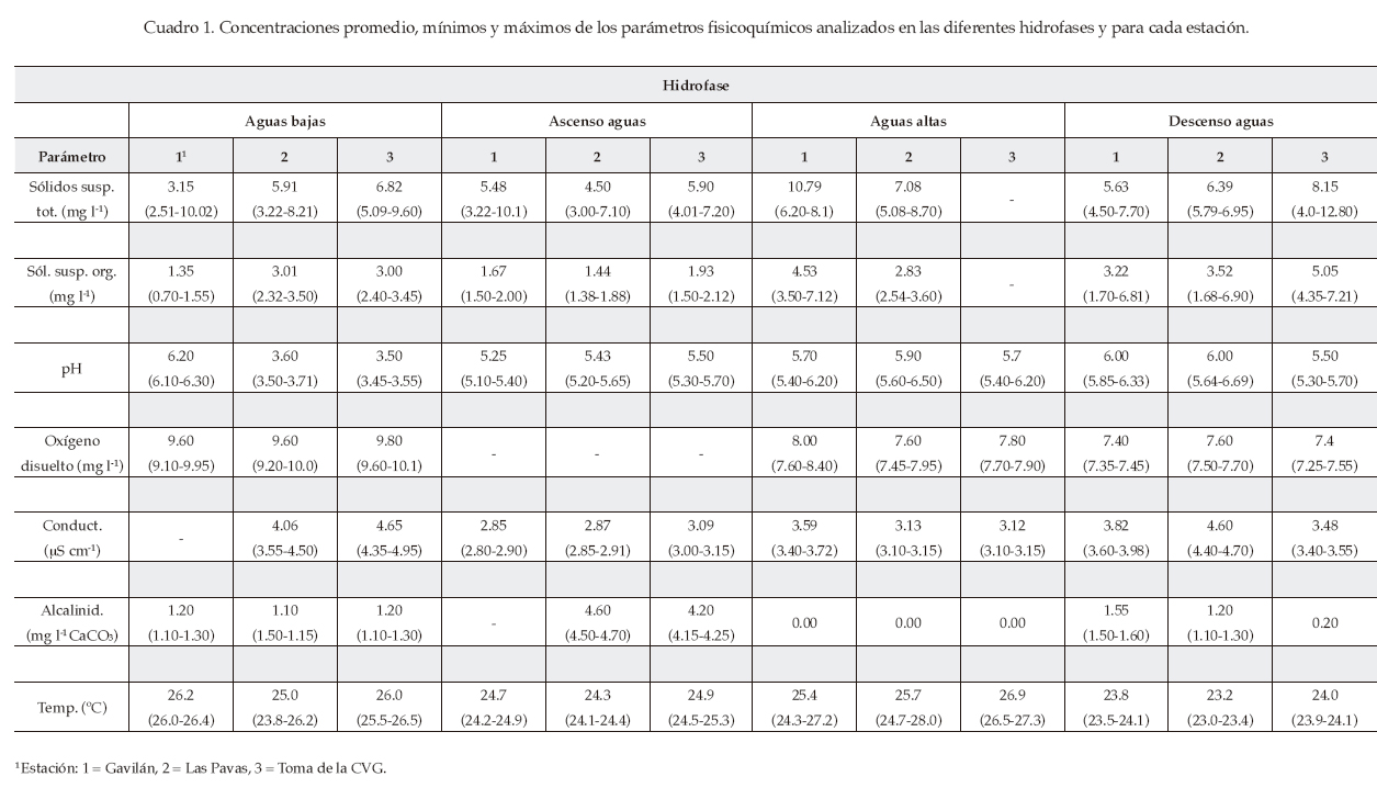 La variación espacial en la concentración de sólidos suspendidos totales presentó un gradiente que va de menor a mayor concentración a medida que se avanzó aguas abajo en las estaciones de muestreo (cuadro 1). Los valores máximos (10.79 mg l-1) y mínimos (3.15 mg l-1) correspondieron a la hidrofase de aguas altas (junio-agosto) y aguas bajas (diciembre-febrero), respectivamente. Se observó un aporte diferencial de material alóctono como consecuencia del régimen lluvioso de la zona. Los mayores ingresos de este material ocurrieron en la hidrofase de las aguas altas, en la que se produce un constante y abundante flujo de solutos y partículas hacia el río, tanto a nivel superficial como a nivel subterráneo, reflejándose este proceso en los mayores valores de concentración de sólidos en esa fase. En el muestreo correspondiente a la hidrofase de aguas bajas (época seca) se observaron los menores valores de sólidos suspendidos como consecuencia de la carencia de precipitaciones y por consiguiente de los aportes terrestres provenientes de la cuenca, así como también de la escasa corriente presente en el canal principal del río. En cuanto a la fracción orgánica de los sólidos suspendidos, se detectaron las mayores concentraciones en la estación representativa de la sección baja del río (toma CVG) con valores de 5.05 mg l-1 (cuadro 1).