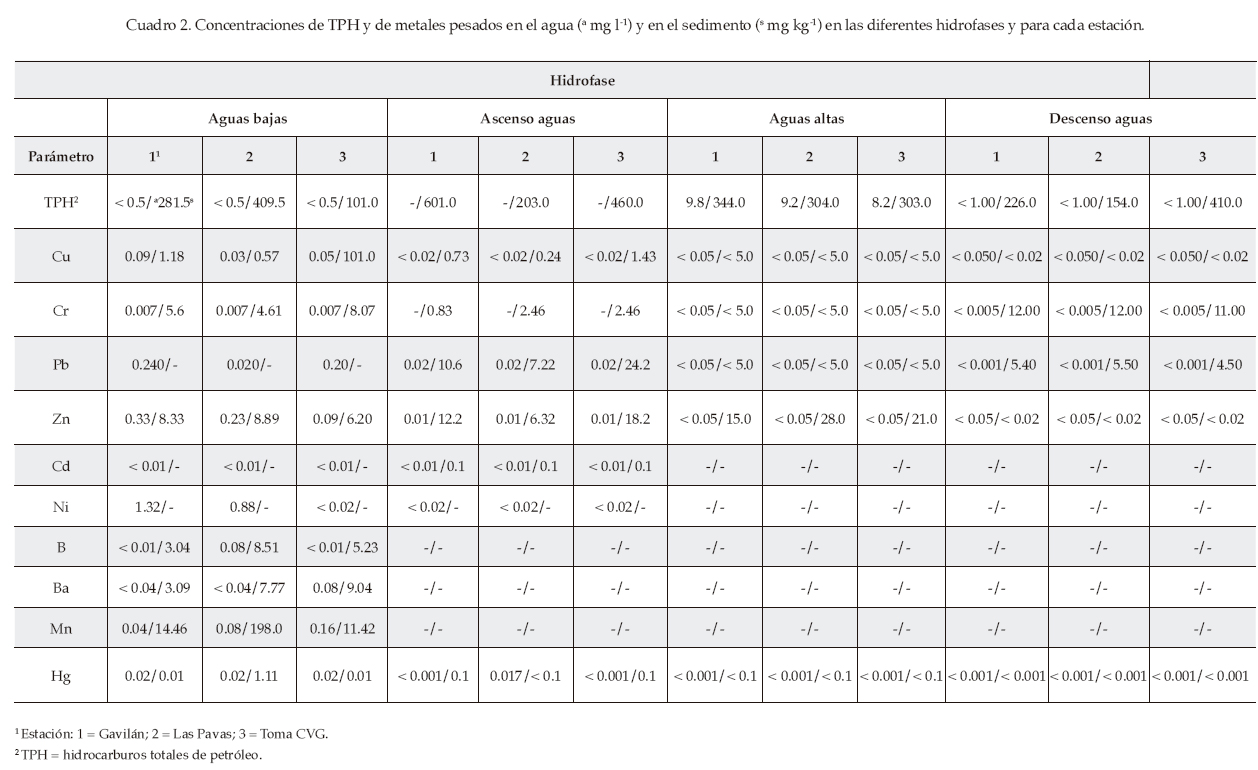 La presencia en el agua de hidrocarburos derivados del petróleo (TPH) estuvo comprendida entre los 0.5 y los 9.8 mg l-1 en las hidrofases de aguas bajas y aguas altas, respectivamente (cuadro 2). Estos valores son muy superiores a las normativas establecidas por la EPA (0.0 mg l-1), la del MARNR (0.3 mg l-1) y la de la UE (0.01 mg l-1) para aguas de consumo.