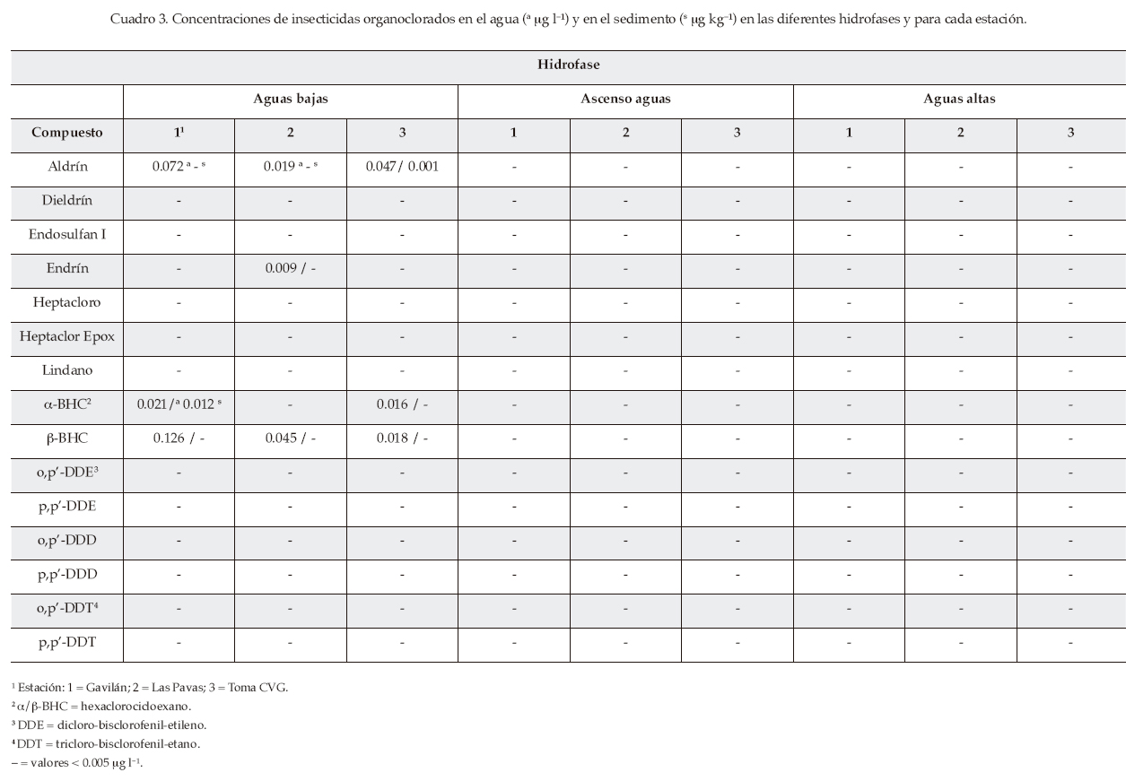 Se detectaron concentraciones altas de dos insecticidas organoclorados: aldrín (0.072 μg l-1) y ß-BHC (0.126 μg l-1), ambos en la estación de Gavilán, representativa de la sección alta del río, y solamente en la hidrofase de aguas bajas del río (cuadro 3). Estos valores exceden a los considerados como límite por las agencias ambientales norteamericanas y europeas: 0.00005 μg l-1 para el aldrín y 0.01 μg l-1 para el ß-BHC (Cubillos, s.f.; UE, 1998; EPA, 2008).