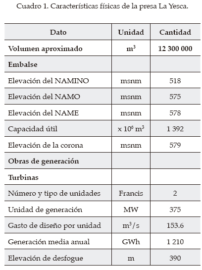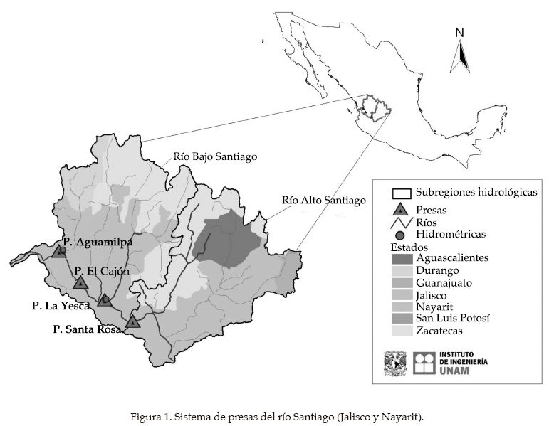 El río Santiago se localiza en el occidente de la república mexicana. Nace en el lago de Chapala, en el estado de Jalisco, a una altitud de 1 500 msnm, y sigue su trayecto por los estados de Jalisco y Nayarit. A lo largo de este río se han construido presas, cuyo principal propósito es la generación de energía eléctrica. El sistema está formado por las presas Santa Rosa, La Yesca (actualmente en construcción), El Cajón y Aguamilpa. En la figura 1 se ilustra una vista en planta de la forma en que están dispuestas estas presas y en la figura 2 un perfil.
