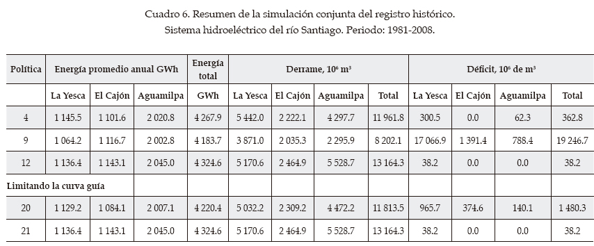 Se hicieron diversas combinaciones de valores de coeficientes de penalización para los casos de déficit, derrame y rebase de la curva guía para los dos valores de discretización del volumen útil considerados. Para castigar el derrame se consideraron valores de 10 000 y de 100 000; para el déficit, de 100, 1 000 y 10 000, y para el rebase de la curva guía, de 1 000. Se hicieron combinaciones de estos valores y con cada política que se obtuvo se simuló el funcionamiento en forma quincenal del sistema. Al analizar el conjunto de resultados obtenidos se seleccionaron las políticas que mejor desempeño tuvieron (maximizar generación de energía y minimizar los derrames, déficits y rebases de la curva guía). En el cuadro 6 se muestra un resumen de los resultados que se obtuvieron al simularlas usando el registro histórico.
