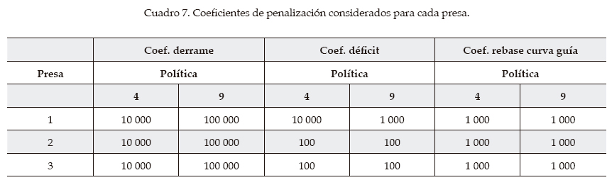 Se incluyó también en el cuadro 6 la política 9, que resulta al imponer las penalizaciones indicadas en el cuadro 7, para mostrar cómo cambian los resultados al modificar las penalizaciones. Así, al comparar los resultados de las políticas 4 y 9, se observa que al aumentar la penalización por derrame y disminuir la de déficit en la presa 1, y aumentar la de derrame en las presas 2 y 3, la energía total generada disminuye muy ligeramente, mientras que el derrame total en el sistema disminuye un 30%, pero el déficit se incrementa exageradamente, a niveles que la CFE consideró inaceptables, por lo que la política 9 se descartó para los análisis posteriores.