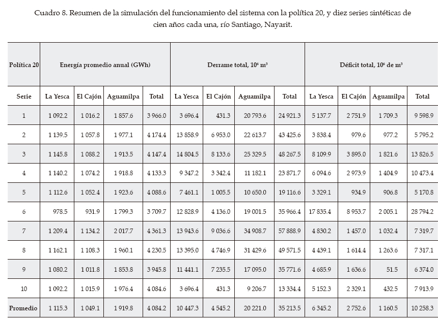 Respecto a la generación de energía promedio anual, con objeto de tener un parámetro cualitativo de comparación, se utilizó la estimación reportada por la CFE (CFE, 2010), que para El Cajón es de 1 228 GWh, mientras que las simulaciones con las políticas 4 y 12 reportan 1 102 y 1 143 GWh, respectivamente; es decir, que se tiene una diferencia de 126 GWh con la política 4, la que se reduce a 85 GWh con la política 12. Para la presa de Aguamilpa, la generación media anual estimada por la CFE es de 2 133 GWh y los resultados que alcanzan las dos mejores políticas (la 4 y la 12) es de 2 021 y 2 045 GWh, lo que da una diferencia de 112 y 88 GWh, respectivamente. La comparación con las estimaciones de la CFE es sólo cualitativa debido a que en la referencia utilizada no se indican los datos de escurrimiento y evaporación ni la eficiencia de generación que utilizaron.