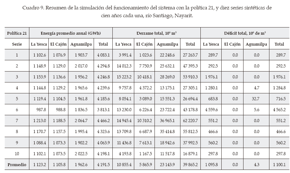 Para tener un periodo más confiable de simulación del sistema, que aporte mayor detalle respecto a los posibles eventos extremos (situaciones de derrames y déficits), se generaron diez series sintéticas de cien años cada una, y se hizo con ellas la simulación de las políticas 20 y 21. Al comparar los resultados de las simulaciones con la política 20 (cuadro 8) con los de la política 21 (cuadro 9), se tendría con la primera un derrame promedio de 35 213.5 millones de m3 en cien años para la suma de las tres presas, contra 39 865.2 millones de m3, para la política 21; esto es, un 13% de aumento en la magnitud del derrame. En el caso del déficit, el promedio en el sistema sería de 10 258.3 millones de m3 en cien años con la política 20, contra los 1 100.1 millones de m3 de la 21; en este caso, el déficit disminuiría en cerca del 90%; es decir, con la política 21 se tendría un déficit mucho menor en el sistema. Es interesante resaltar que estos resultados son congruentes con los obtenidos para el registro histórico, lo que confirma la validez de las secuencias generadas.