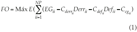 La función objetivo que se propuso consiste en la maximización del valor esperado del beneficio por generación, imponiendo penalizaciones en el caso de déficit, de derrame o bien de rebase de la curva guía propuesta para cada presa, quedando la siguiente expresión: