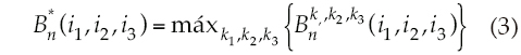 (i1, i2, i3), el beneficio esperado hasta la etapa n en cada uno de los estados i1, i2, i3, dadas las extracciones k1, k2, k3; B*n+1(j1, j2, j3) , el valor esperado óptimo correspondiente a la extracción óptima k* en la etapa n + 1.