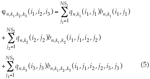 Donde 1, 2 o 3 es el subíndice que identifica la presa (La Yesca (1), El Cajón (2) o Aguamilpa (3)); A, el producto de las probabilidades de transición, qn,ki (ii ji) i = 1, 3 en la etapa n, dadas las extracciones k1, k2, k3, y los estados iniciales, i, y finales, j, de cada presa; bpar, la suma del beneficio en la etapa, n, dados los estados inicial, i1, i2, i3, y final j1, j2, j3 y sus respectivas extracciones k1, k2, k3;