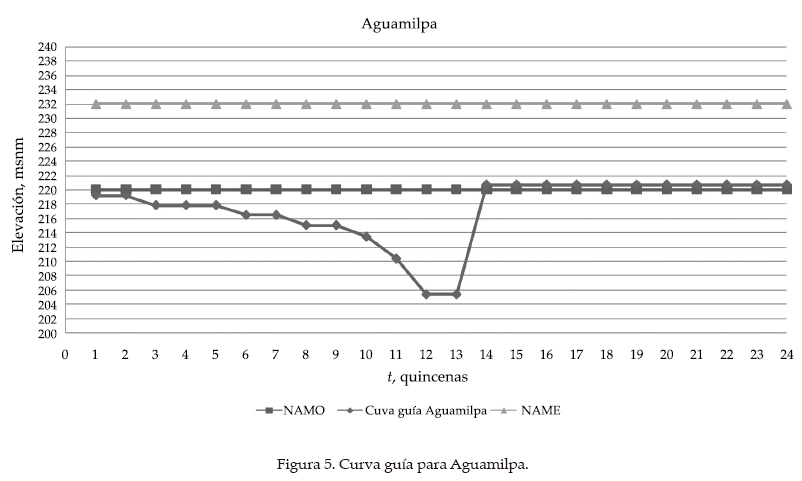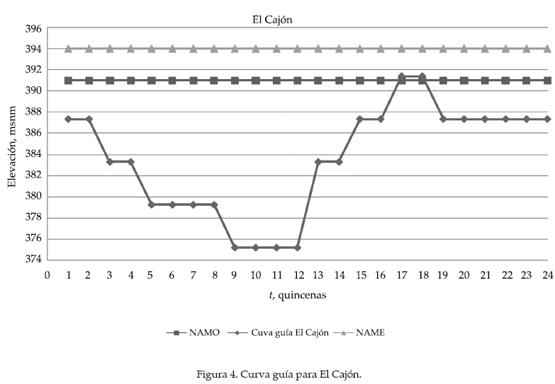 Se determinó la probabilidad de los volúmenes ingreso para cada una de las etapas, a partir de los valores históricos registrados en el periodo común de 1981 a 2008. Para las curvas guía de El Cajón y Aguamilpa se utilizaron las elevaciones máximas históricas quincenales. Para La Yesca se propuso una curva guía similar a la de El Cajón, aumentándole un estado, pero sin sobrepasar su nivel de aguas máximo extraordinario (NAME). Las figuras 3, 4 y 5 muestran la curva guía para cada presa.