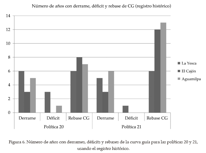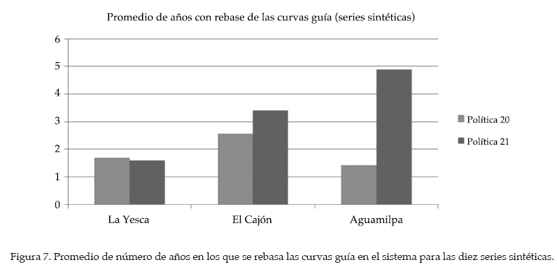 Se puede apreciar que la política 20 tiene un mejor control sobre este evento que la política 21; con la primera se rebasa la curva guía en La Yesca cada 1.7 años, 2.6 años en El Cajón y casi cada, 1.4 años, en Aguamilpa; mientras que con la política 21, en La Yesca, cada 1.6 años se rebasa la curva guía; cada 3.4 años en El Cajón, y casi cada cinco años en Aguamilpa.