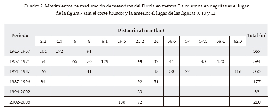 La medida de los segmentos en los movimientos de profundización (maduración) del bajo Fluvià se da en el cuadro 2. En total suman 1.73 km de corrimiento de orillas perpendicularmente al flujo del agua en 64 años desde 1945. Destaca el periodo 1957-71 también por el número de sitios con movilidad (9) y el movimiento total por año (42.4 m/año). Además no constan en el cuadro otros 662 m de movimiento de progresión de curvas (corrimiento de orilla en la misma dirección del valle, acompañando al de maduración), ni tampoco los movimientos bruscos por corte natural o estrangulamiento de meandros.