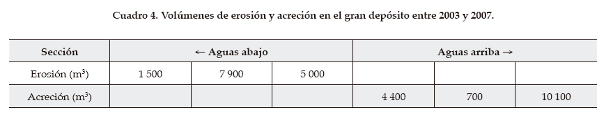Se aplica este método al gran depósito mediante seis secciones transversales de las topografías de 2003 y 2007 (la cuarta de ellas es la figura 10, derecha). El resultado (véase cuadro 4) da sumas V1 = 15 200 m3 de acreción y V2 = 14 400 m3 de erosión, muy parecidas entre sí. Aceptando V1 = V2 = 15 000 m3 y dividiendo por los 51 meses transcurridos entre las dos topografías, resulta Qs > 3 500 m3/año. Esta cifra, que se encuentra dentro del intervalo 700-8 000 m3, puede compararse también con el volumen acumulado en los dos embalses mayores a lo largo de ochenta años, que resulta de 350 000 / 80 = 4 375 m3/año (o 3 125 m3/año si se computa sólo el embalse superior), también dentro del mismo intervalo. Una diferencia de esta última estimación es que los embalses contienen sin duda material grueso traído por las crecidas de caudal mayor que Q1.