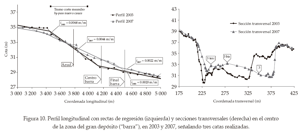 La causa del corte fue sin duda la tala del bosque. El desbordamiento por la margen izquierda no encontró el freno de la vegetación. Además, la pendiente por este curso es mucho mayor, no sólo por ser más recto, sino porque incorpora el desnivel concentrado en la presa. Es como una captura del río por las ventajas de una pendiente mayor y un terreno aluvial sin vegetación. Gracias a dos topografías (Modelos Digitales del Terreno o MDT) de 2003 y 2007, se puede conocer mejor el comportamiento reciente del gran depósito aluvial. En el perfil longitudinal (figura 10) está ocurriendo una rápida acreción (subida de fondo aguas abajo del azud). En 2003, la pendiente del nuevo brazo era más del triple (0.68%) que la de los tramos contiguos no afectados todavía por el corte (≈ 0.20%). De 2003 a 2007 hay una basculación del perfil (de 0.68 a 0.44%). Este proceso no se ha acabado, seguirá con acreción abajo y erosión remontante hacia arriba hasta un equilibrio futuro con una pendiente más uniforme. En una sección transversal por el centro del gran depósito aluvial (figura 10) se ve cómo la acreción crea el gran depósito, al mismo tiempo que la orilla derecha retrocede. La acreción es de 1.1 m en la cota del thalweg, el cual ha saltado del lado izquierdo al lado derecho de la barra. La orilla seguirá erosionándose en el futuro.