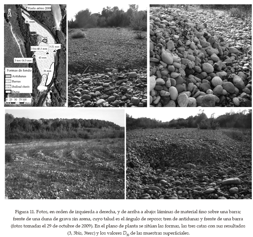 El gran depósito presenta formas de fondo de varias dimensiones y tamaños de grano, a veces superpuestas, prueba de la gran actividad sedimentaria reciente. Las más grandes son las barras, sobre las que se identifican láminas (bedload sheets), dunas e incluso antidunas (figura 11). Las láminas se crean por el transporte de material fino cuando el flujo no es capaz de mover todos los tamaños, por ejemplo durante el descenso de la crecida que formó las barras. Las dunas, poco comunes en ríos de grava como el Fluvià, aparecen aisladas, a veces rodeando a la vegetación, son de gran altura y constituidas por grava gruesa sin arena (figura 11). También son raras en ríos de grava las antidunas y aún más raro que se conserven tras la crecida, como el tren de unas ocho ondas de ½ m de altura de la figura 11. Pudieron formarse en el descenso de la crecida por el desagüe rápido, en régimen supercrítico, de la parte alta del cauce hacia el thalweg más hondo (ver figura 10). Finalmente, las barras son las formas de mayores dimensiones (macroformas), de frente semejante a las dunas (mesoformas), pero guardando relación con la anchura del cauce, no con el calado, y son precursoras de la formación de meandros. Las conforman flujos elevados, mientras en aguas bajas se convierten en islas o depósitos de interior de curva (point bar). En el lugar de estudio se observaban varias barras con frentes de onda bien diferenciados.