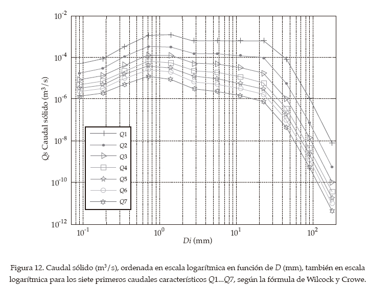 La capacidad de transporte sólido se puede evaluar por medio de fórmulas de transporte. El gran depósito es apropiado para esta evaluación porque es un área muy activa. Se toma la zona del centro del gran depósito, en donde la granulometría es conocida con detalle, simplificando la sección transversal correspondiente a 2007 (figura 10), porque nos conformamos con evaluar el orden de magnitud de esta capacidad. En el mismo sentido, se utiliza régimen uniforme con rugosidad en función del tamaño D90 del promedio de las granulometrías. De las innumerables fórmulas de transporte, de resultados dispares entre sí, elegimos la de Wilcock y Crowe (Parker, 2008), que calcula el transporte por fracciones, teniendo en cuenta el efecto de exposición-ocultamiento, propio de lechos con grano muy variado, y el efecto del contenido de arena. Por otro lado, se elabora la curva de frecuencia de caudales de un año y medio, a partir de los datos de la estación de aforos más próxima. Para los siete primeros días del año y para tamaños entre 1 y 200 mm, el transporte sólido en m3/s se representa en la figura 12. La suma resulta en lo que se muestra en el cuadro 3 y la figura 12.