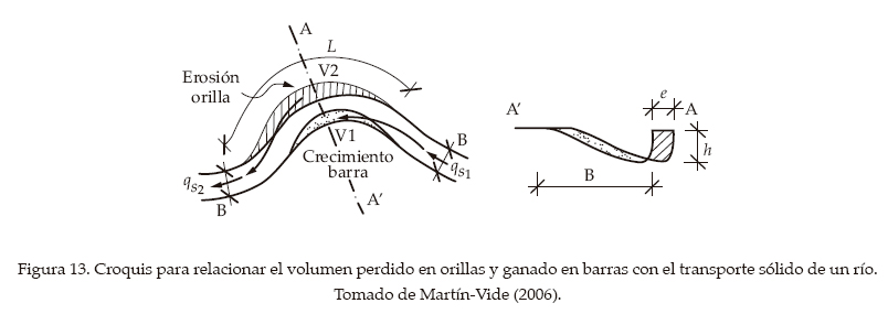 La movilidad del bajo Fluvià, en particular el lugar del corte del meandro, nos ofrece otra posibilidad de estimación del caudal sólido. Una curva en planta se mueve porque la orilla exterior cede (se erosiona) y al mismo tiempo la barra interior crece (figura 13). Si a la curva entra un caudal sólido Qs1 y de ella sale un caudal Qs2, hay equilibrio si Qs1 = Qs2. Si el fondo no sube ni baja, este equilibrio se sigue respetando aunque se mueva la planta, siempre que los volúmenes de erosión (V2) y sedimentación (V1) sean iguales. La carga Qs2 se nutre del volumen de erosión V2, además del transporte del río; análogamente, la carga Qs1 alimenta al volumen de acreción V1, además de contribuir a este transporte. El caso límite es si Qs1 se queda al 100% en la barra y Qs2 proviene al 100% de la orilla. Entonces Qs1 = V1 y Qs2 = V2 (dividiendo los volúmenes por el tiempo). En general, será Qs1 > V1 y Qs2 > V2 (ídem), o sea, una parte de lo que sale circula sin interactuar ni con la barra ni con la orilla. En conclusión, V1 y V2 son cotas inferiores del caudal sólido.
