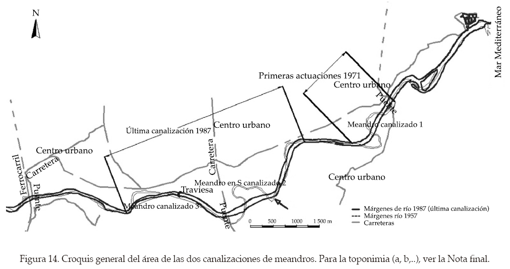 La figura 14 es el croquis del tramo del río Fluvià cercano a la desembocadura, lugar de las dos mayores canalizaciones con corte de meandros. La atención se centra en la de aguas arriba (de 1987) a 8 km del mar, cuya restauración es más viable. Antes de 1987, este meandro en forma de S (meandro 2) había tenido movimiento de maduración (91 + 70 + 41 m, cuadro 2) y un desplazamiento del conjunto hacia la izquierda. No tuvo en cambio movimiento de progresión, lo que se debe relacionar con el punto final de la S, fijo y de curvatura anormalmente elevada, señal de un material no erosionable. La canalización acortó en 810 m el curso mediante un arco de círculo de gran radio, descentrado con respecto a la S, de modo que se puede confundir con el corte de un solo lóbulo, grande, el izquierdo. El canal construido tiene 120 m de anchura y bordos revestidos de escollera. Se excavó el fondo del orden de 2 m. Parece ser que estas excavaciones se han repetido después para mantenimiento y extracción de áridos. Un nuevo puente sobre el Fluvià se ejecutó en combinación con la canalización. El cauce antiguo sólo se ha rellenado en la intersección con los terraplenes de esta nueva vía, pero en el área de los antiguos meandros se extraen áridos. Completando el cuadro, fue necesario construir una traviesa para que el rebaje de 2 m de la canalización no se propagara aguas arriba.