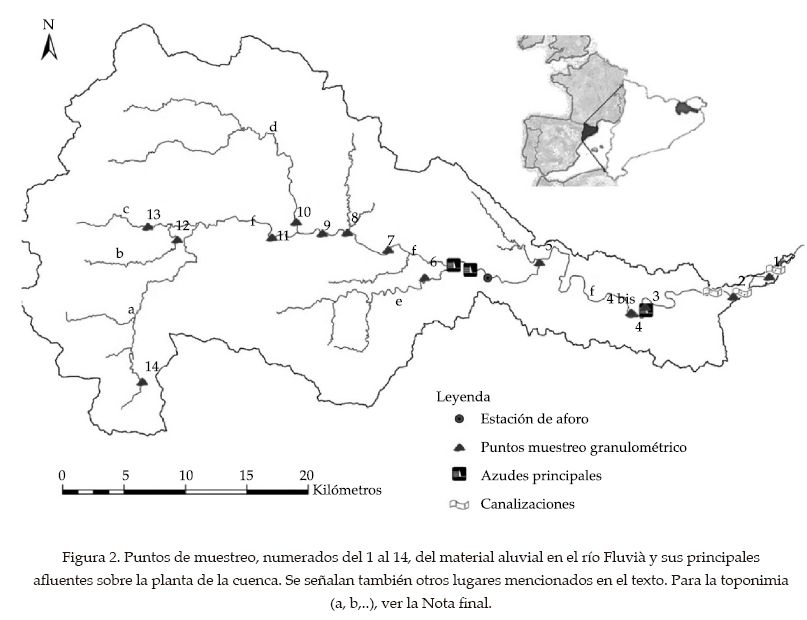 A estos trabajos de gabinete se suma el trabajo de campo posible en el plazo y con los recursos del proyecto: el análisis granulométrico del lecho y la caracterización de las formas fluviales visibles (barras). En los siguientes apartados se verá cómo se utilizan estas informaciones de campo, junto con las geográficas, batimétricas, morfológicas, hidrológicas, sobre la vegetación y sobre el transporte sólido, para componer el cuadro del comportamiento morfodinámico del río Fluvià.