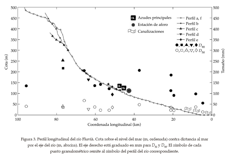 El perfil longitudinal del río Fluvià, elaborado con un modelo digital del terreno de 2003 de resolución 1 x 1 m, se presenta en la figura 3. Una colada basáltica atravesada por el río explica la pendiente tan elevada en el tramo comprendido entre el km 70 y el km 80, contando desde el mar, y la escasa pendiente en el tramo superior siguiente. En el otro extremo, en los últimos kilómetros, el fondo está bajo el nivel del mar por la excavación realizada en las canalizaciones. Entre el km 5 y el km 35, el perfil es casi recto (pendiente constante de ≈ 0.25%). Se distinguen en todas partes muchos pequeños saltos, pero sobre todo en el km 45 uno de 8.3 m construido en 1925, y en el km 47 uno de 6.9 m de 1929, que son las dos mayores presas hidroeléctricos con batimetría de sus embalses.