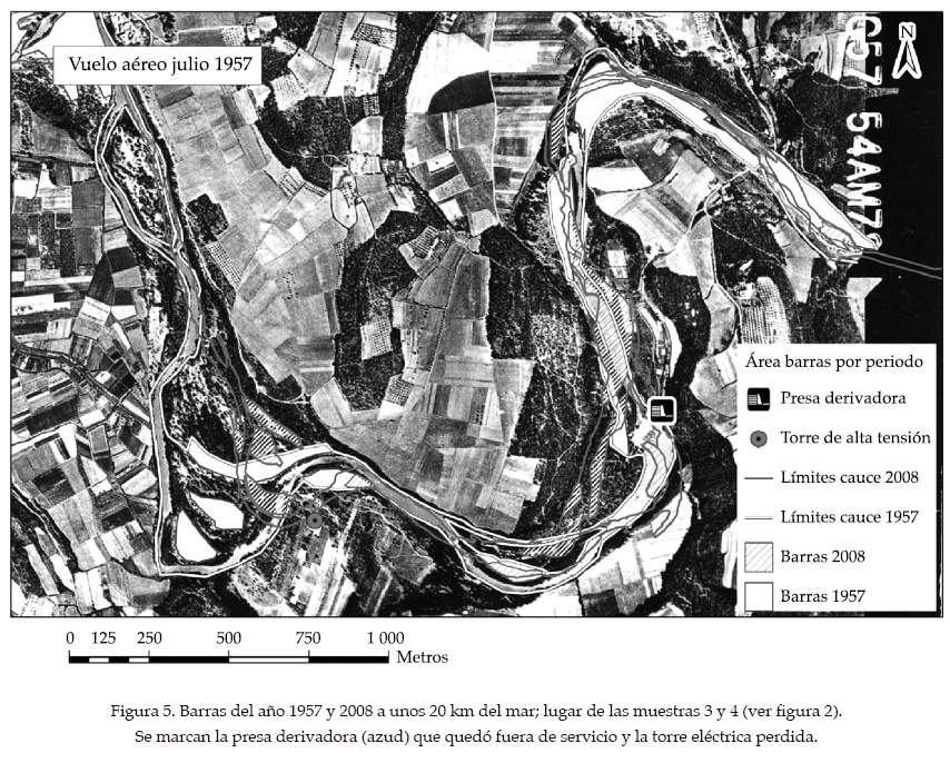 Por otro lado, se trata a continuación de la superficie de barras activas entre 1957 y 2008, determinada mediante SIG. Un ejemplo es la figura 5. Merece una mención especial este lugar de gran movilidad, con su centro a unos 20 km del mar, donde han ocurrido los recientes incidentes de la presa que quedó fuera de servicio y de la torre eléctrica. Sobre el fondo del vuelo de 1957 se dibujan en la figura 5 las barras de las dos fechas (1957 y 2008). De todas formas, se observa que en 1957, la superficie de gravas desnudas de vegetación era bastante mayor que hoy. La representación gráfica de la evolución de la superficie de gravas con el tiempo se da en la figura 6. Es clara la tendencia a la reducción de los depósitos aluviales en los últimos 52 años, incluso después de descontar los depósitos perdidos por el dragado en las obras de canalización de los meandros próximos a la desembocadura en 1971-1987. El penúltimo dato se puede considerar como una activación circunstancial, ya que la avenida del 8 de mayo de 2002 (269 m3/s) ocurrió poco antes del vuelo de 2002. Quizá también es circunstancial la "desactivación" de 2008, por falta de crecidas importantes en los últimos años. Pero uno o dos meses antes del vuelo de 1957 ocurrió una avenida de 145 m3/s menor que la de 2002, pese a lo cual el área de gravas es casi el doble en 1957 (184 ha) que en 2002 (116 ha).