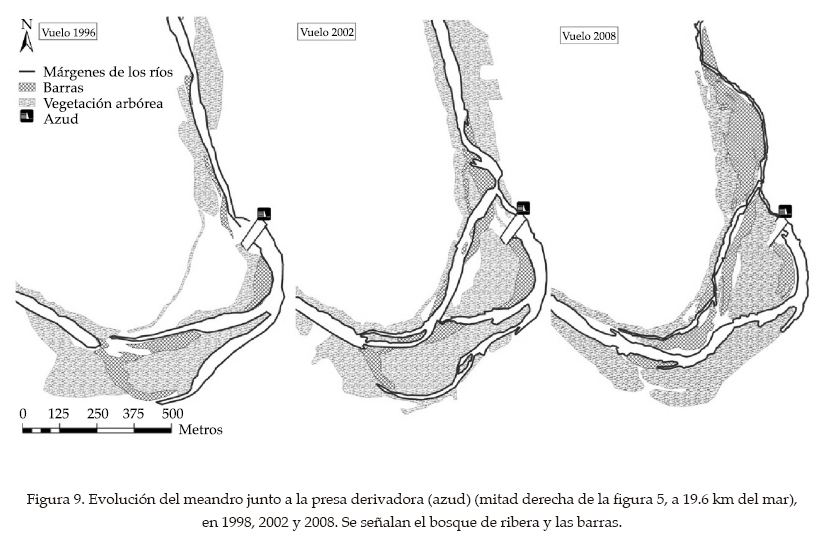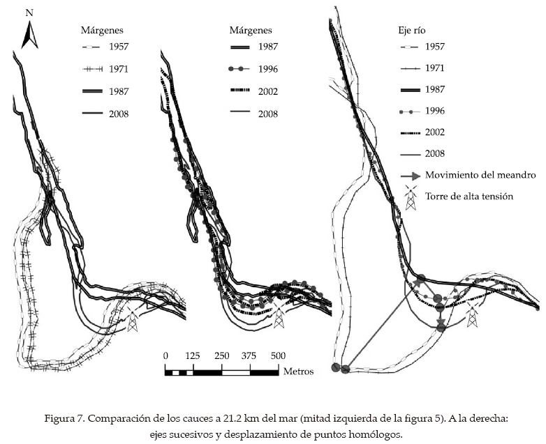 La mitad derecha de la figura 5 es el lugar que ha tenido la mayor movilidad reciente (138 m, cuadro 2). La otra mitad es la ya representada en las figuras 7 y 8. En ellas se apreciaba la dinámica típica de un meandro: progresión hacia aguas abajo y profundización a través de la llanura, con un estrangulamiento para volver a un curso más recto en algún momento del periodo 1971-87. La dinámica posterior causó la caída de la torre eléctrica. Es interesante señalar que las dos mitades están separadas por un tramo rectilíneo de 250 m, cuya alineación se ha mantenido inalterada desde 1957. Esto es un ejemplo de cómo la resistencia a la erosión de orillas determina la movilidad fluvial (la inmovilidad en este caso).