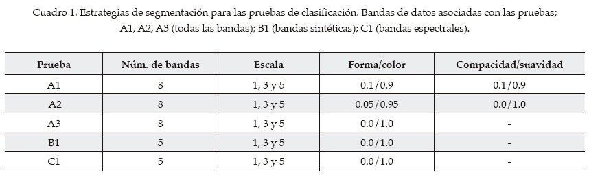 Junto con evaluar la relación entre la magnitud de los parámetros de segmentación y la precisión de la clasificación, se evaluó el efecto de utilizar tres combinaciones distintas de datos de entrada (cuadro 1). Las pruebas A1, A2 y A3 utilizan todos los datos de entrada (ocho bandas); la prueba B1 utiliza sólo bandas sintéticas (cinco bandas) y la prueba C1 utiliza sólo bandas espectrales (tres bandas).