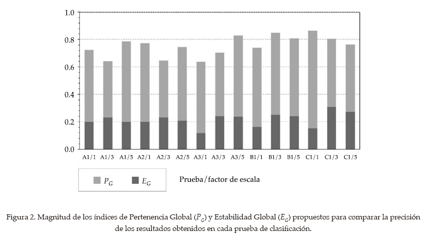 La proximidad de un objeto a una clase y su consecuente clasificación difusa con un alto nivel de pertenencia no necesariamente indica que la clasificación es correcta. Ante una escasa diferencia entre la proximidad de un objeto a dos clases, la clasificación resultante se considera inestable. A partir de las estadísticas generadas en cada prueba de clasificación se calculó la pertenencia y estabilidad global como un promedio ponderado por la superficie de los objetos clasificados. Se proponen en este trabajo los índices de Pertenencia Global (PG) y de Estabilidad Global (EG) como un método para calcular la precisión alcanzada en cada clasificación: