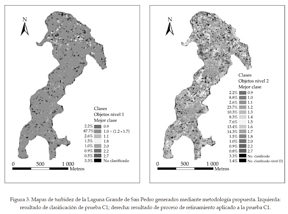 Los resultados de la clasificación del total de las pruebas definidas mostraron que entre el 82.7 y el 96.4% de la superficie de la laguna se asignó a clase "1.0 + [1.2 - 1.7]". La segunda clase con mayor superficie fue "1.1", que abarcó entre un 2.6 y un 6.8%. La superficie no clasificada resultó menor al 0.8% y se redujo conforme los objetos fueron generados con un mayor factor de escala. Los objetos no clasificados se concentraron principalmente en la proximidad al perímetro de la laguna, donde los objetos se mostraron menos homogéneos. Con los datos utilizados y las pruebas definidas, los resultados señalaron que los objetos generados con un factor de escala 3 permiten aumentar la distancia entre clases e incrementar el rango dinámico de turbidez detectado en la laguna.