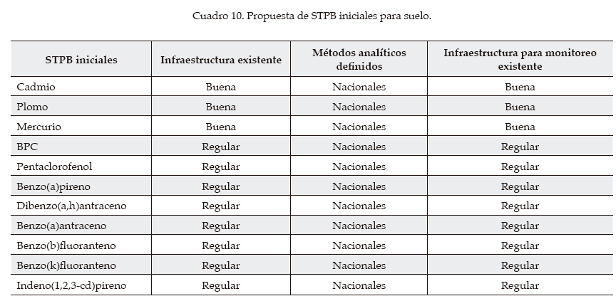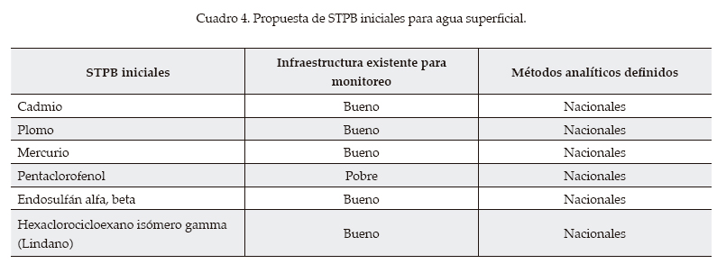 Etapa 3. Considerando la importancia de iniciar el programa de monitoreo de STPB sin necesidad de realizar investigaciones preliminares, cambios en la normatividad o infraestructura existente, se identificaron las STPB incluidas en normas y criterios mexicanos, cuyo monitoreo puede ser implementado de manera inmediata. Estas STPB cumplen con los siguientes criterios: