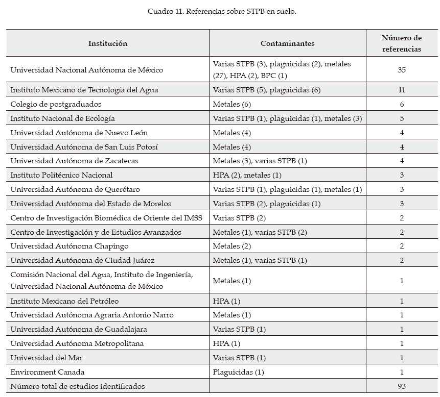 Se identificaron 93 referencias sobre STPB en suelo en el país, mismos que se relacionan principalmente con plaguicidas y metales, así como HPA y BPC en algunos de ellos (cuadro 11), sugiriendo que existe infraestructura buena y regular, respectivamente, para el monitoreo de estas sustancias.