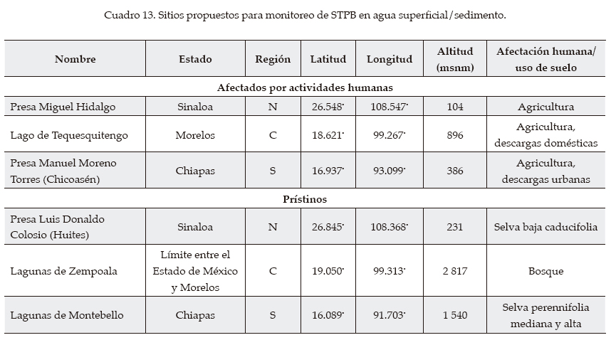 Para sitios tanto afectados como prístinos, se buscó que tuvieron accesibilidad o cercanía a estaciones de programas existentes de monitoreo de contaminantes. Entre los programas de monitoreo de contaminantes se consideró la Red Nacional de Monitoreo (RNM) de la Comisión Nacional del Agua (Conagua, 2011), donde desde 1970 se monitorea la calidad fisicoquímica y microbiológica de agua subterránea y superficial en cuencas hidrológicas. La infraestructura y logística existente de la RNM puede representar una excelente base para incluir el monitoreo de STPB, ampliando así la lista de parámetros que actualmente se evalúan.