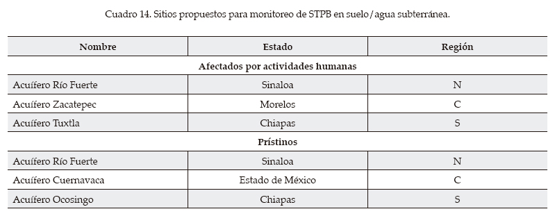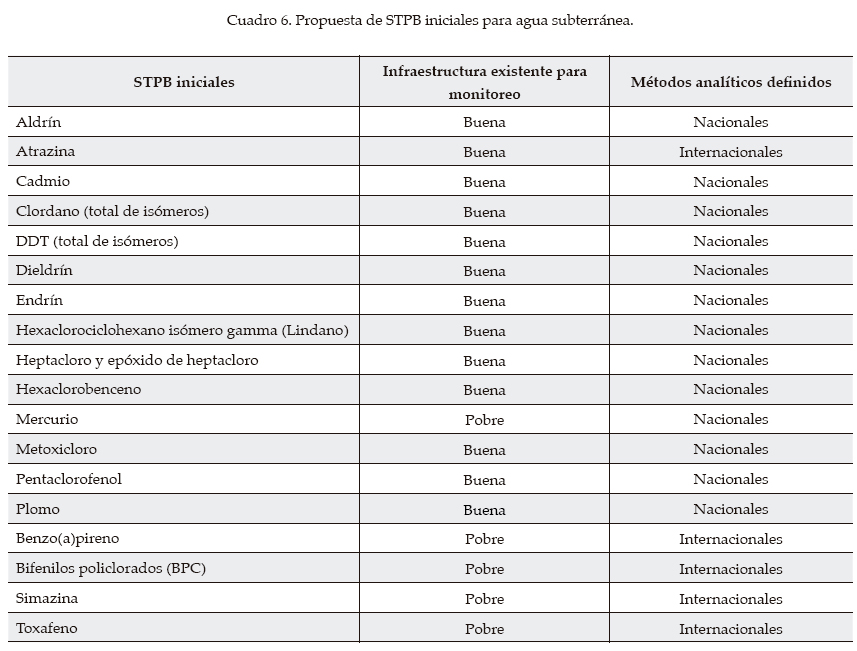 Para agua subterránea se propone considerar las 18 STPB incluidas en la normatividad nacional (cuadro 6), sujeto a disponibilidad de infraestructura, de acuerdo con las referencias identificadas en la literatura. Son relativamente pocos los estudios realizados en nuestro país sobre STPB en agua subterránea, identificándose sólo 35 (cuadro 7), y los STPB evaluados pertenecen principalmente a la categoría de metales y plaguicidas. Debido a la falta de referencias sobre mercurio, benzo(a)pireno, BPC, simazina y toxafeno, se pueden excluir de la lista inicial de STPB, y realizar evaluaciones de riesgo, así como establecer la infraestructura y capacidades necesarias antes de considerar su inclusión para monitoreo en agua subterránea en México.
