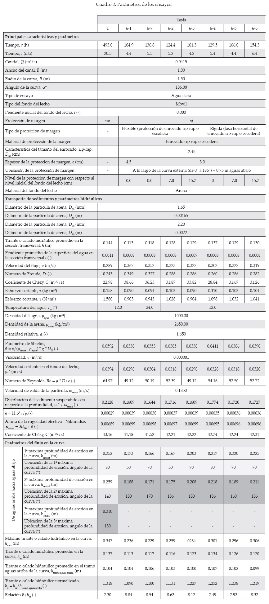 El objetivo de la presente investigación, que se encuentra inspirado en las múltiples curvas abruptas de los ríos amazónicos del Perú (Alvarado-Ancieta y Ettmer, 2008), fue el estudio de: a) el flujo y la topografía del cauce en curvas cerradas o abruptas de ríos con un transporte predominante de material de fondo, y b) la influencia de las obras de protección de márgenes en la curva externa en un modelo experimental efectuado en laboratorio. Los objetivos del estudio incluyeron la determinación de la máxima erosión enfrente de la margen externa para las condiciones de equilibrio. Para reducir la complejidad del problema, se consideraron algunas restricciones al objetivo de la investigación. En el canal se usó un ancho constante, se consideró que las márgenes no sufren erosión, que la curva es cerrada o abrupta (R/B = 1.5) y, finalmente, que las condiciones límite son constantes en el tiempo. Los ensayos se ejecutaron bajo las condiciones de cauce móvil, fijo y parcialmente fijo, y no se efectuó el abastecimiento de sedimentos desde aguas arriba (producto de esto, que la erosión fuese estudiada en agua clara). Ambas clases de ensayos se ejecutaron con y sin obras de protección de margen. Los experimentos en una curva abrupta de laboratorio fueron realizados para proveer, tras los ensayos, adecuado material para el estudio de la erosión en curvas abruptas de ríos y, en el futuro, para su uso en un modelo matemático. La topografía de fondo fue medida con bastante detalle y de la misma manera fue estudiada con minuciosidad la evolución de las diferentes secciones transversales topográficas en el tiempo. La erosión y formación de la barra de sedimentos se estudiaron haciéndolas adimensionales, usando para ello calados o tirantes normalizados. Otros aspectos estudiados incluyeron la pendiente transversal del fondo, la superficie de agua y los perfiles de niveles del cauce, la ubicación del talweg, y el transporte de sedimentos y formas de fondo. Con respecto a las características del flujo, se estudiaron los parámetros de flujo en curva, perfiles de velocidad e isotacas, la componente del flujo lateral y las celdas de circulación secundarias. Con respecto al estudio de la turbulencia del flujo, se consideró tratar éste posteriormente. Además, la investigación experimental se ejecutó de manera eficaz mediante la disposición de un velocímetro acústico doppler (ADV) tridimensional, además de uno bidimensional. Asimismo, la respuesta de la topografía de fondo medida en una curva abrupta de río se estudió usando el análisis de adaptación del flujo y del cauce de Struiksma et al. (1985), y se concluyó que esta aproximación no es aplicable bajo las condiciones de ratios muy bajos de transporte de sedimentos y altas condiciones de curvatura. Las aparentes condiciones tridimensionales de flujo en curvas abruptas son muy diferentes de las condiciones de flujo quasi-bidimensional, en las cuales estuvo basado el análisis de Struiksma. Las pendientes transversales de fondo medidas resultaron aceptables bajo el cálculo del método de predicción de Odgaard (1984). En el modelo experimental, también se estudió la influencia de las obras de protección de margen a lo largo de la curva externa. Se estudiaron dos tipos de protección de margen, descritas aquí como protección de margen flexible una y protección de margen rígida la otra, habiendo sido ambas elaboradas de enrocado (rip-rap) o escollera. Es así que una protección de enrocado (simulando una protección en la naturaleza) fue modelada como una protección de margen flexible (ver figura 2), y una losa horizontal de escollera conectada a la curva externa fue concebida como una protección de margen rígida.
