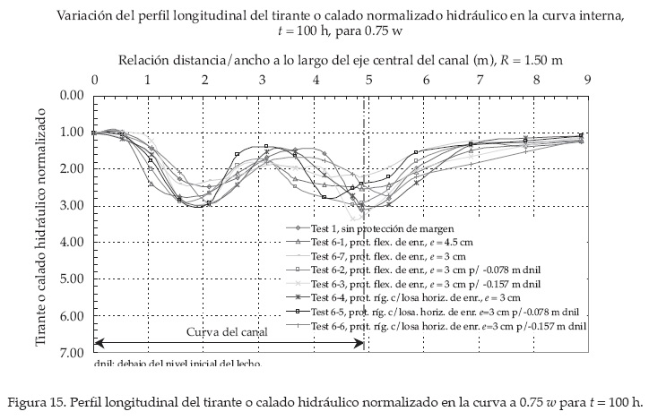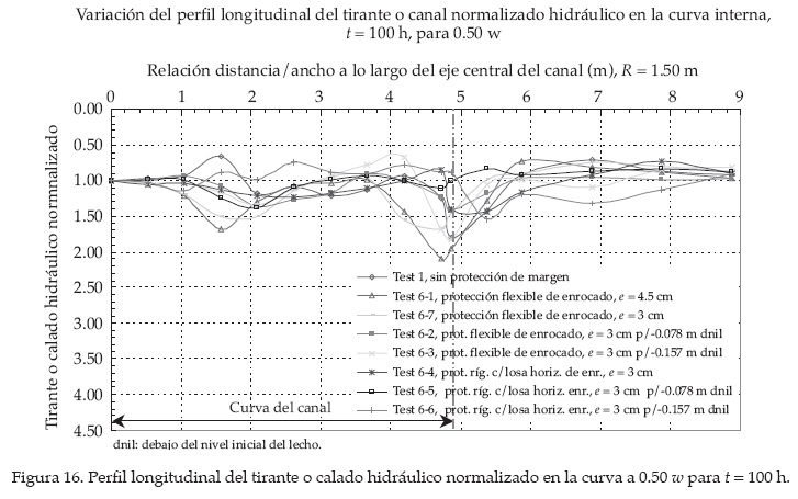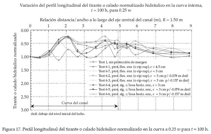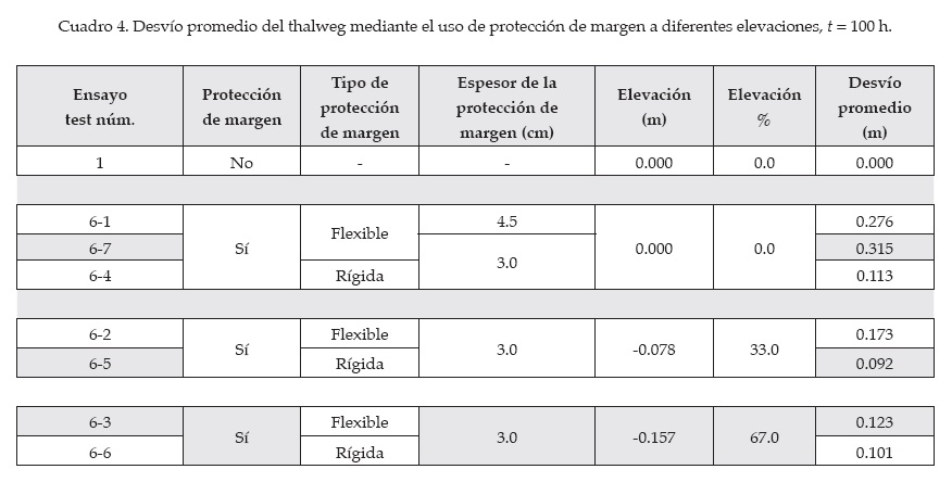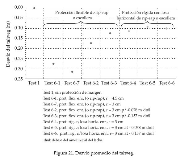 En el ensayo test 6-7 se alcanzó una desviación del talweg de aproximadamente 31.5 cm, medido desde la margen externa. En la figura 20 se presenta la ubicación del talweg para t = 100 h. En el cuadro 4 y la figura 21 se presenta la desviación del talweg para t = 100 h. Aparentemente, no se observaron mayores cambios en la ubicación final del talweg después de t = 100 h para todos los ensayos con protección de margen.
