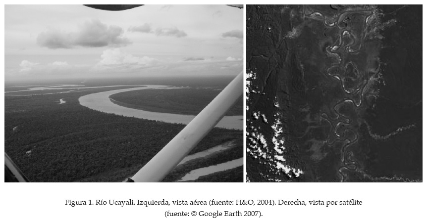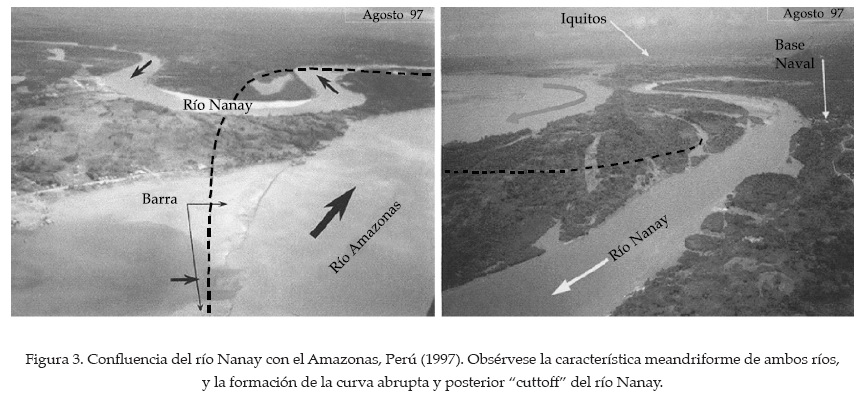 Los ríos de la amazonia peruana, ríos aluviales y de pendiente suave, son meandriformes, y en ellos se presenta una profunda erosión en la margen externa (curva cóncava) de las curvas de los ríos, y es precisamente en aquellas zonas donde se ubican poblaciones o infraestructura básica de desarrollo, siendo el principal problema la protección contra inundaciones debido a erosión de las márgenes externas débilmente protegidas, tal como ocurre en los tramos de población a lo largo de los ríos Marañón, Ucayali y Amazonas (ver figura 3). Tricart (1977) atribuye los numerosos cortes de meandros "cutoffs" en los ríos de la cuenca amazónica a la cantidad de sedimentos en suspensión. Los sedimentos que se depositan en la curva cóncava son fácilmente erosionados, en especial mediante la socavación que ocurre durante época de crecientes o avenidas. Sin embargo, la acumulación de sedimentos en suspensión sobre la curva convexa es mínima. Los meandros migran y se distorsionan hasta que colapsan por nuevos cortes de meandros.