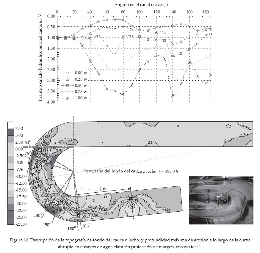 1. En una curva abrupta, las líneas de corriente no pueden seguir los límites curvilíneos y por consiguiente ocurre un distanciamiento con respecto a estos límites debido al fenómeno del flujo secundario como el flujo turbulento. Éste inicia la deposición de sedimentos en las zonas de circulación más lenta que se observan notoriamente en la curva interna. Esta turbulencia forma un patrón de flujo curvo, similar a aquel que se produce en una curva menos abrupta. Por consecuencia, un patrón de flujo similar resulta en el flujo helicoidal, en el que las líneas de corriente sobre la superficie del agua y el fondo del cauce son direccionadas hacia la curva externa desde el centro de rotación y hacia el centro de rotación, respectivamente. En todos los ensayos se forma un área profunda desde el inicio de la curva a lo largo del margen interno hasta más abajo del final de la curva. Además, se forman dos barras de sedimentación, las cuales son el producto de la oscilación de la pendiente lateral del fondo del cauce. El asociado pico de profundidad "overdeepening" se presenta en dos regiones, las cuales fueron ubicadas entre los 20º antes del fin del primer y segundo cuadrantes de la curva. La socavación se desarrolla en la curva externa, al final de la curva, y se extiende en el tiempo en la dirección hacia aguas abajo. Al mismo tiempo, una fosa de erosión evoluciona en la margen interna, al inicio de la curva, y se mueve en el transcurso del tiempo de aguas arriba hacia aguas abajo y hacia la curva externa, siendo esta socavación primero alcanzada por la erosión que se forma en la curva interna. Los dos puntos máximos de profundidades en la curva externa coinciden en ubicación con los puntos pico observados en la curva interna.