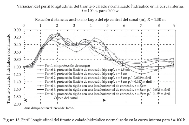 12. El dimensionamiento del enrocado de protección de la curva externa se efectuó considerando la velocidad del flujo en la cercanía de la roca. Se aplicaron las fórmulas propuestas por Pilarczyk (1990), Maynord (1993) y Julien (2002), las cuales consideran la sobre elevación del caudal en curvas; el incremento de la turbulencia ha demostrado estar en este caso sobre el lado seguro para el diseño de protección de escolleras. Además, en estos experimentos se demostró que la extensión de la longitud de las obras de protección de margen en la curva externa debe ser prolongada en 1.5 a 2 veces el ancho del cauce después del final de la curva externa. Sin embargo, en la ingeniería práctica de los ríos en la naturaleza, la extensión de la protección del margen debe ser adoptada tomando en cuenta la topografía del cauce existente y las condiciones de alineamiento del cauce del río. La longitud de la protección debe ser cuidadosamente traducida a las condiciones prototipo.