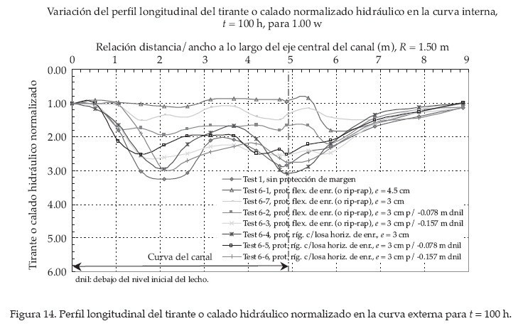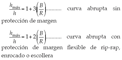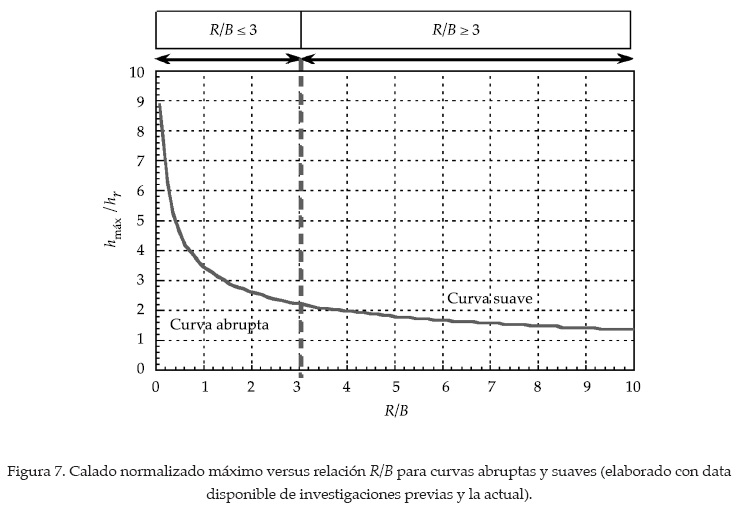 Data registrada en una relación basada en calados máximos normalizados y relación R/B de experimentos previos (Talmon, 1992; Struiksma, 1985; Olesen, 1985; Yen, 1967; Hooke, 1974, 1970; Sutmuller y Glerum, 1980; Odgaard, 1982; Blanckaert y Graf, 1999a y 1999b), y de esta investigación (ver figura 7) muestra que en curvas abruptas el calado máximo normalizado es aproximadamente superior a 2.0 (incremento en el valor), con una relación R/B menor a 3.0. En curvas suaves, el calado máximo normalizado es menor que 2.0 (detrimento en el valor), con una relación R/B superior a 3.0.