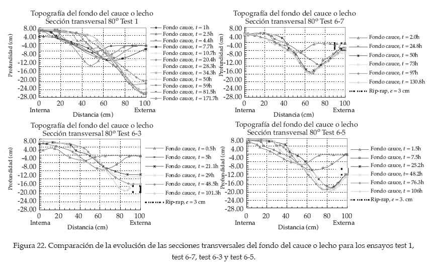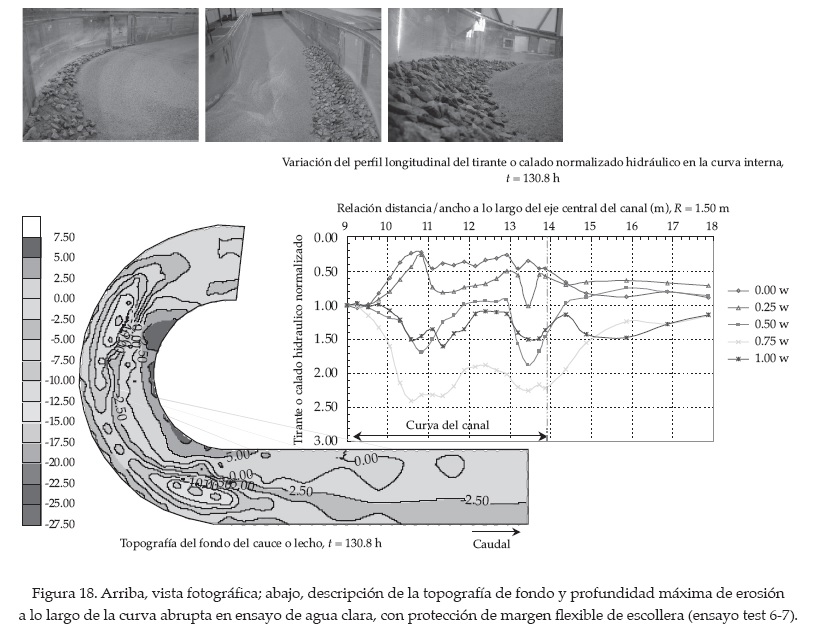 La topografía del cauce es descrita como la deformación del fondo, producto de los cambios de la pendiente lateral del fondo, donde las principales características observadas durante los ensayos fueron la formación de la barra de sedimentos en la curva interna y la evolución de la fosa de erosión en la curva externa tanto en los ensayos sin protección como en los ensayos con protección flexible y con protección rígida.