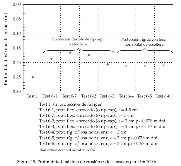 3. El potencial de la técnica de protección de margen flexible fue demostrado con efectividad. La profundidad de erosión se ve reducida mediante la protección de margen. La reducción más significativa fue alcanzada mediante la aplicación de una protección flexible, mientras que con una protección rígida, el resultado fue inferior. El porcentaje de reducción de erosión en los ensayos con enrocado de protección o protección flexible fue el doble de la reducción obtenida para los ensayos con protección rígida. Además, la profundidad de erosión se reduce de manera significativa cuando la protección es colocada al nivel del cauce original, que cuando es colocada a un nivel inferior.